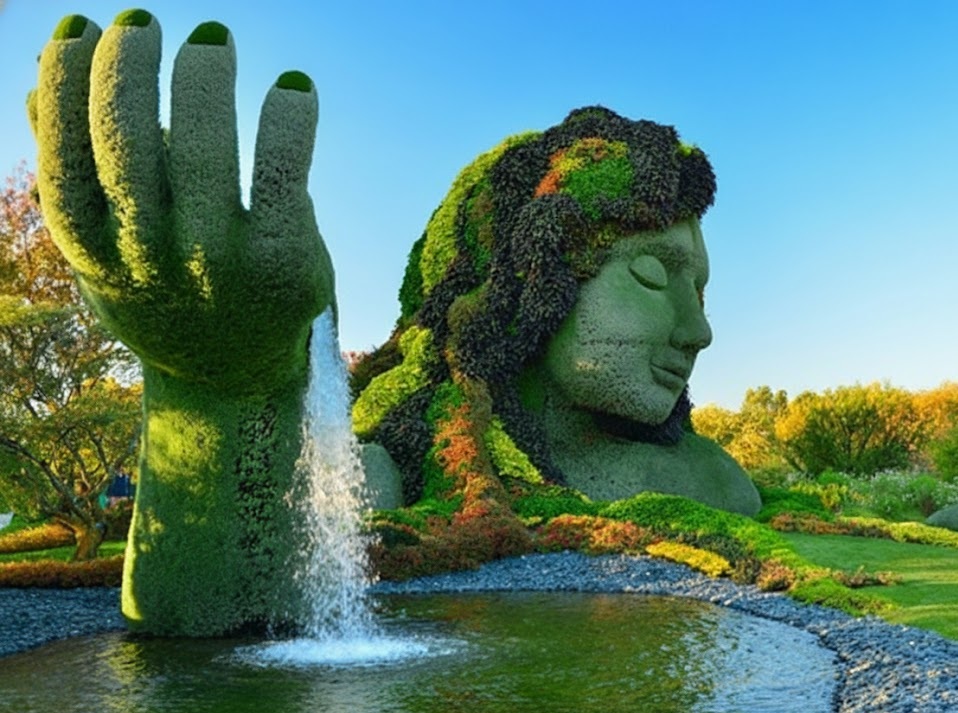 Đài phun nước độc đáo và vô cùng kỹ vĩ này nằm trong một khu vườn tuyệt đẹp. Với kiểu dáng nước được phun ra từ bàn tay của người khổng lồ, với ngụ ý mẹ thiên nhiên mang đến nguồn sống cho nhân loại.